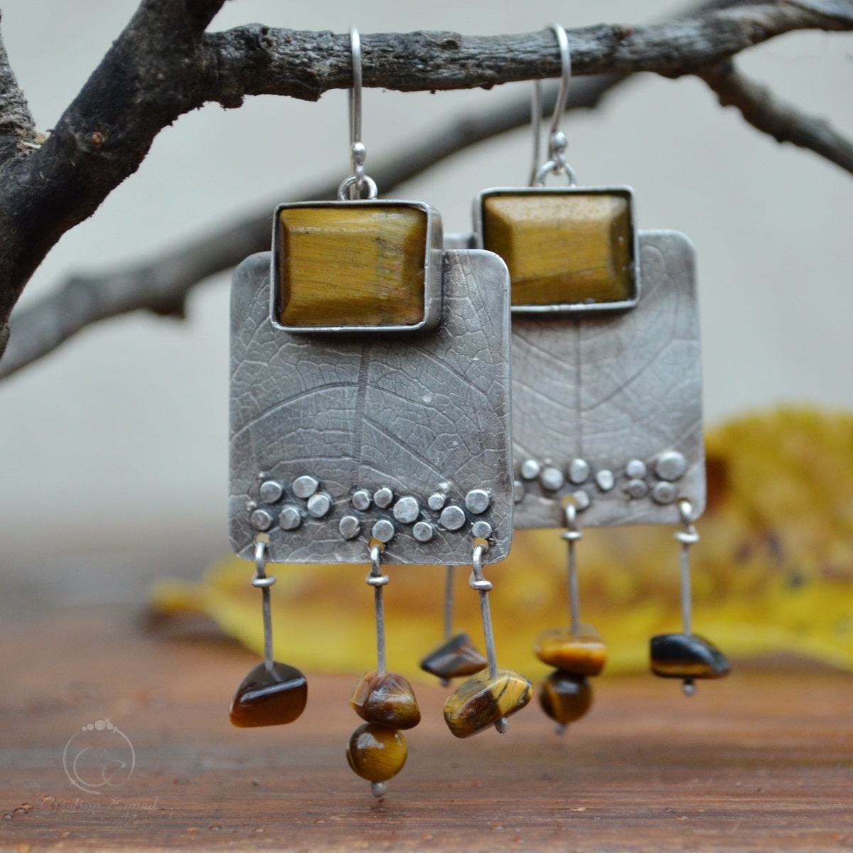 Cercei din argint cu ochi de tigru. Bijuteriile sunt din argint de 925 și pietre ochi de tigru. Cerceii sunt lucrați și finisați individual și prezintă asimetrii și diferențe intenționate.