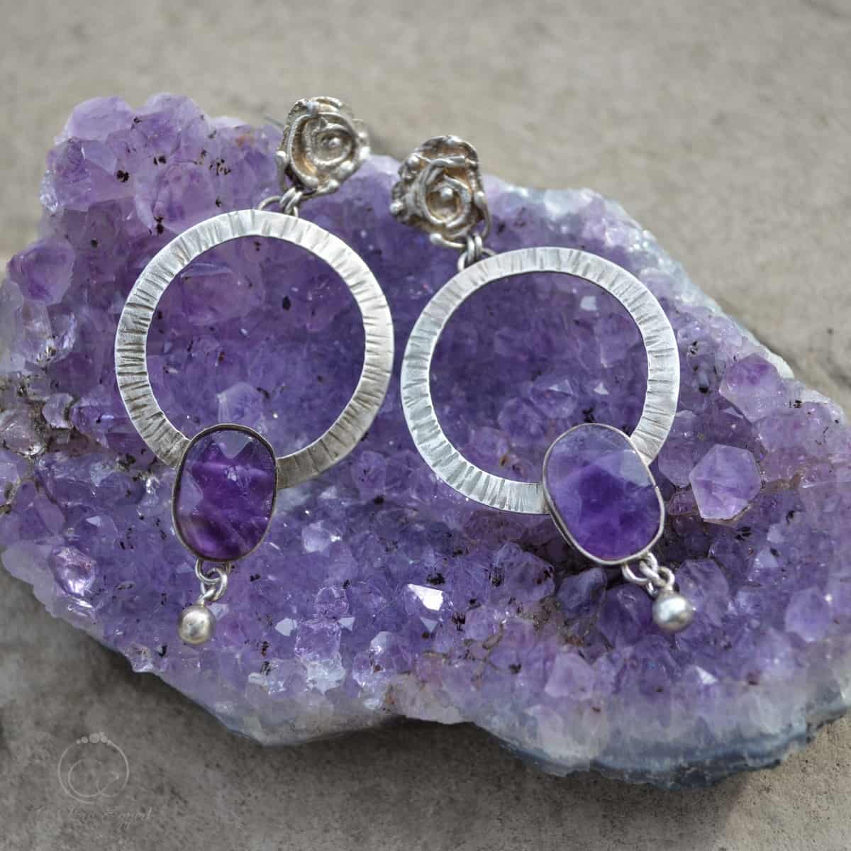 Cercei din argint și ametist realizați manual. Cerceii prezintă mici asimetrii specifice bijuteriilor handmade, de asemena, culoare pietrelor nu este identică.