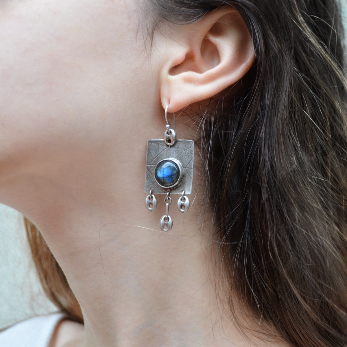 Cercei din argint și labradorit cu reflexii albastre. Bijuteriile sunt lucrate manual din argint cu titlul de 925. Cerceii sunt unicat și prezintă mici asimetrii în ceea ce priveste culoarea, mărimea și irizațiile pietrelor.